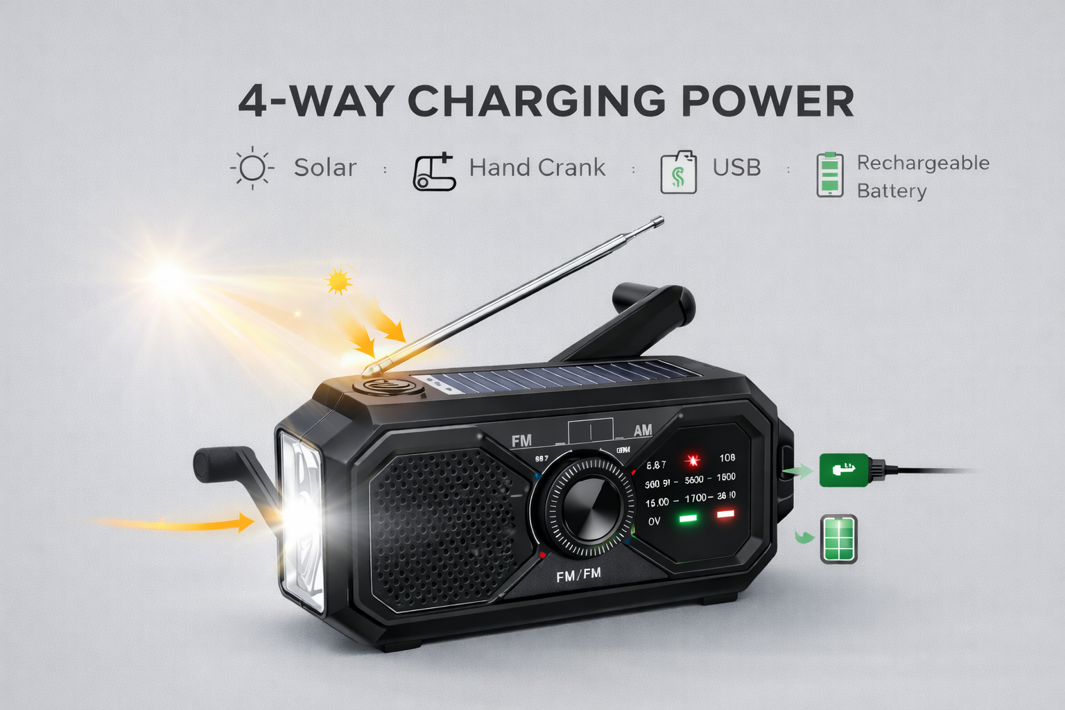 The StormGuard™ radio features multiple charging options including solar charging, hand crank power generation, USB charging, and a built-in rechargeable battery. This ensures you can generate power even when electricity is unavailable.