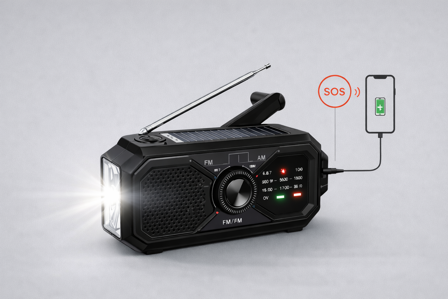 The Urban Shield StormGuard™ Emergency Radio is designed with simple, intuitive controls so you can quickly access light, power, and emergency information when it matters most. The Flashlight/SOS button instantly activates a bright LED light or emergency signal for visibility and safety. Use the AM/FM selector to switch between stations and stay informed during outages or severe weather. The precision tuning knob allows you to easily find clear radio reception, while the power and volume dial lets you quickly turn the radio on and adjust sound levels with ease.