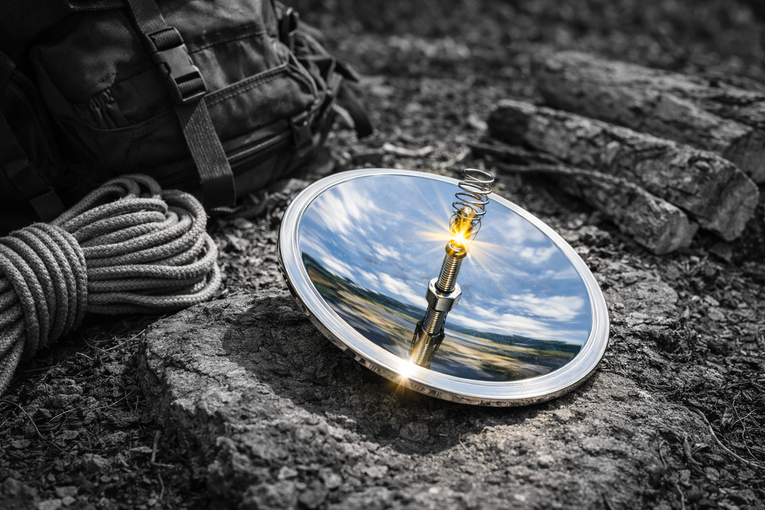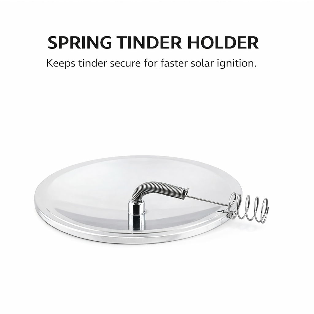 Simply place your tinder in the spring holder and aim the reflective dish toward direct sunlight. The focused beam creates intense heat to spark your fire quickly, making it perfect for camping, survival kits, and emergency preparedness.